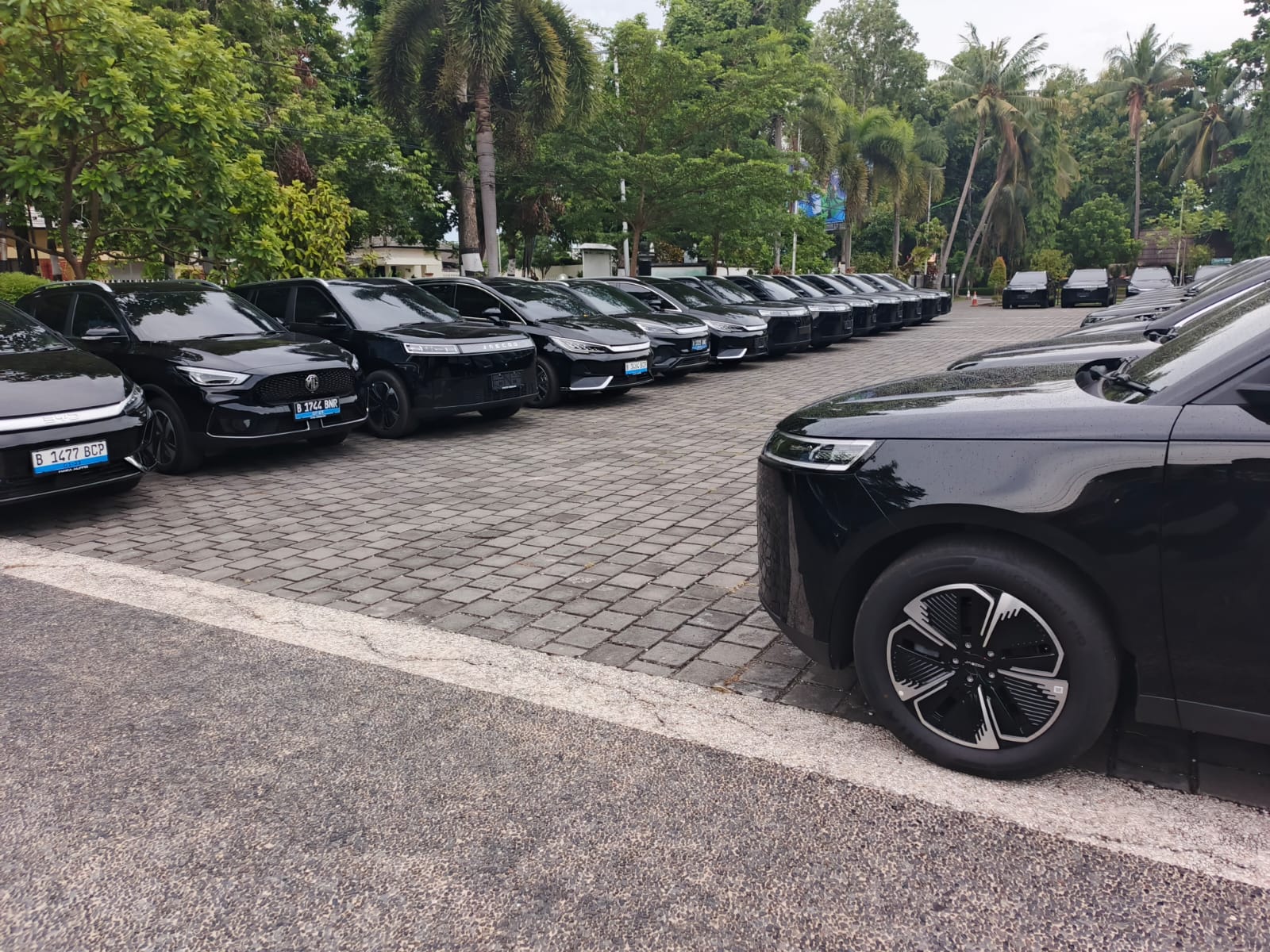 Terlihat merk mobil itu pun berbeda-beda, ada yang bertuliskan JAECOO dan ada juga BYD. Sebagian juga telah terpasang plat kendaraan, yakni plat B, milik daerah Jakarta. Sementara sebagainya belum terpasang plat kendaraan.