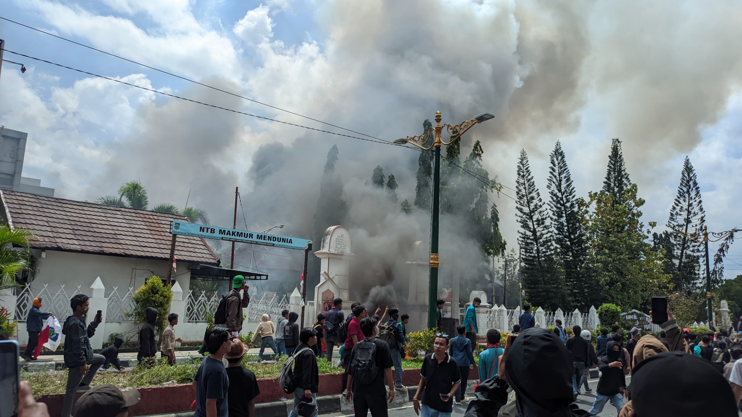Mataram – Bentrokan antara ribuan massa aksi dengan aparat kepolisian masih terus berlanjut di area gedung DPRD Nusa Tenggara Barat, Sabtu (30/8/2025). Polisi berulang kali menembakkan gas air mata untuk membubarkan kerumunan, namun massa tetap bertahan.