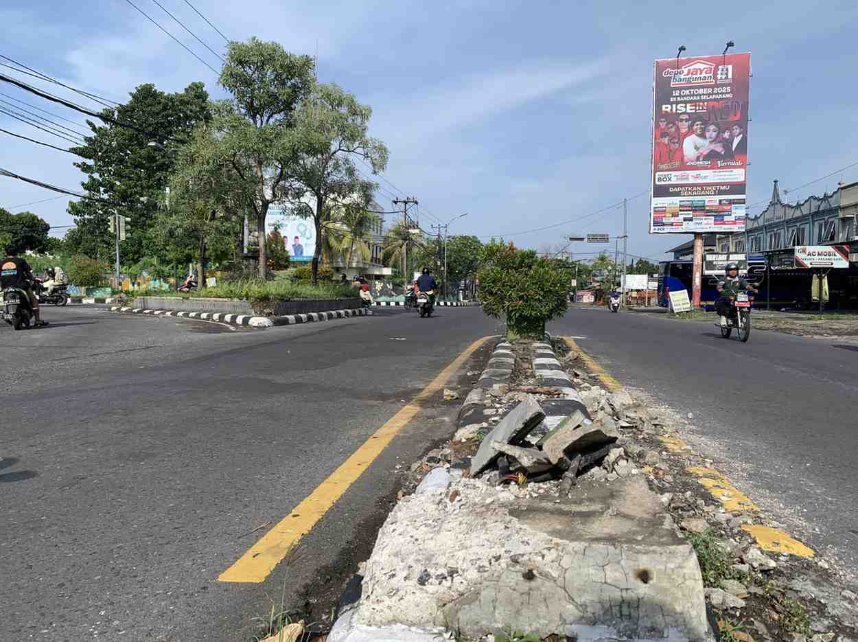Median jalan yang rusak imbas terjadinya 3 Laka Lantas di Simpang 3 Sapari Dharma Raya Bertais, Rabu (22/10/2025). (dok. Buk)