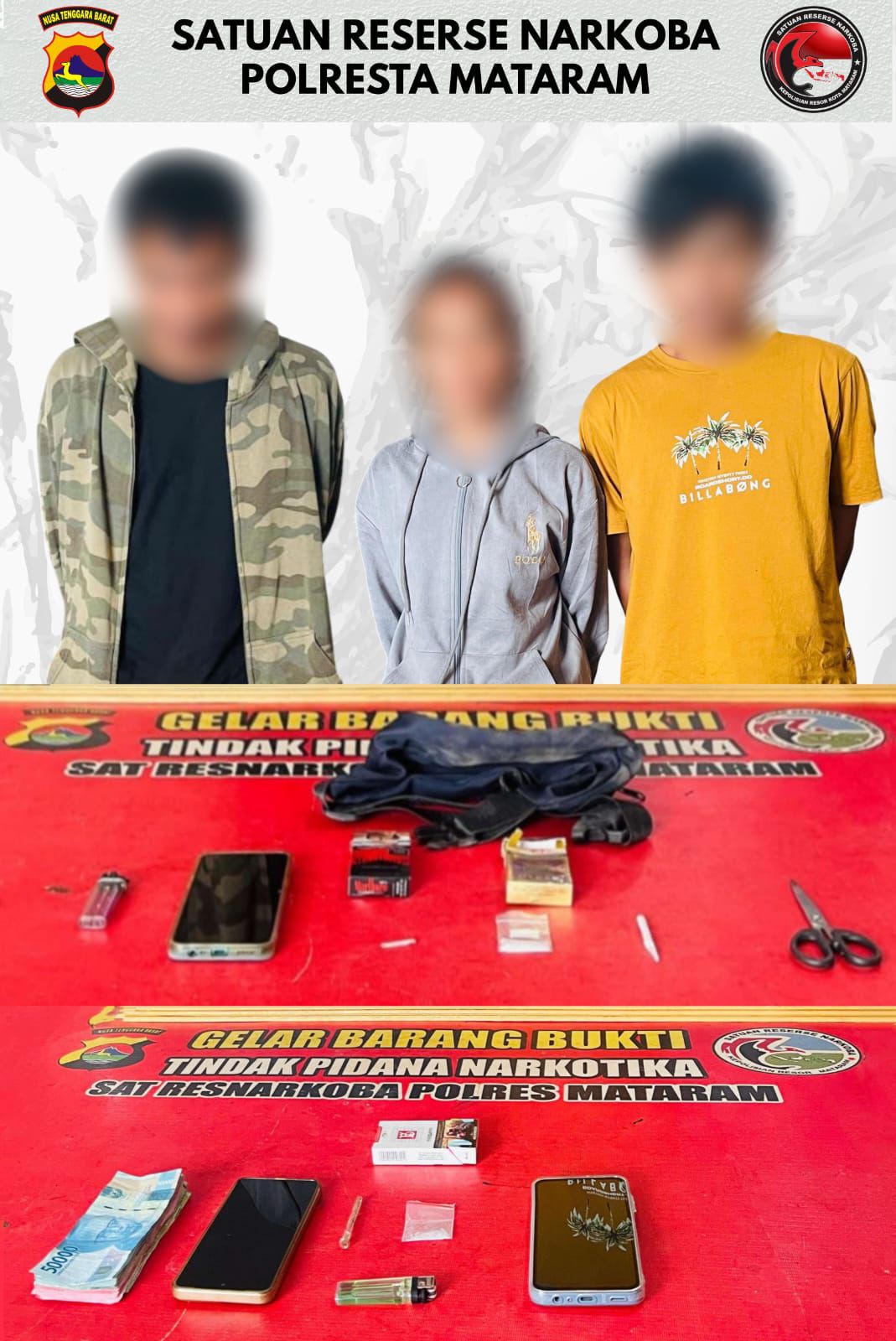 Tiga pelaku beserta barang bukti berupa dua poket sabu, alat hisap, alat komunikasi, dan uang tunai hasil transaksi narkotika. Rabu (6/8/2025) ( Dok. Humas Polresta mataram)