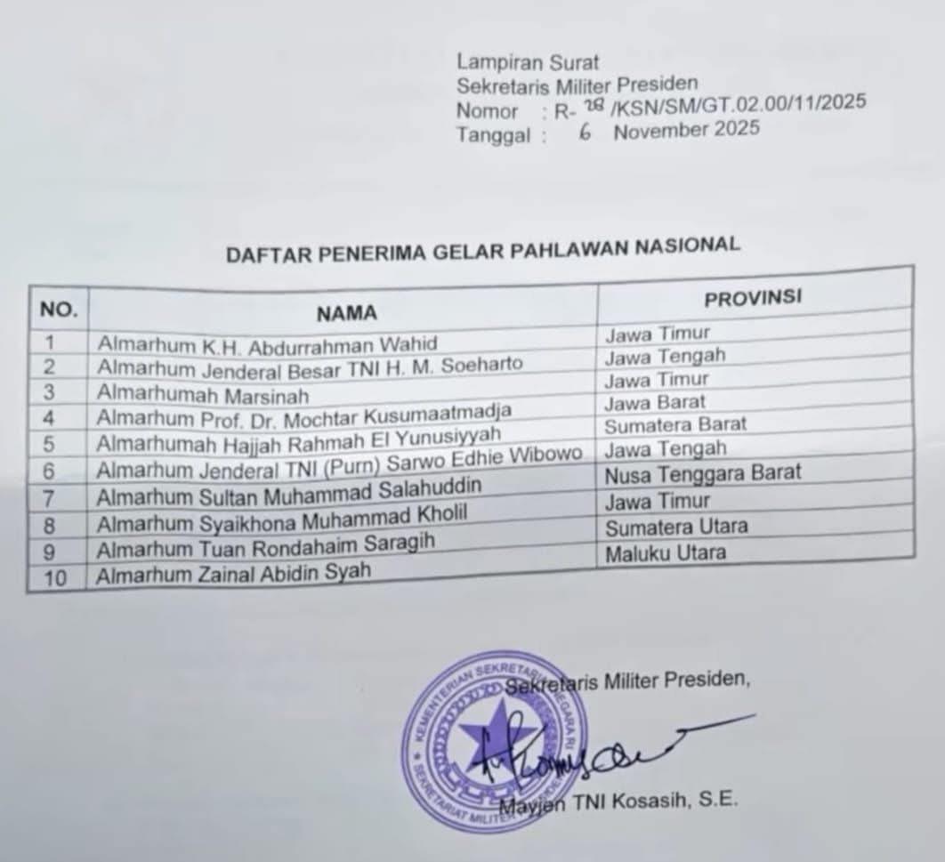 Berikut daftar 10 tokoh yang diberikan gelar pahlawan nasional hari ini dari lampiran surat Sekretaris Militer Presiden :