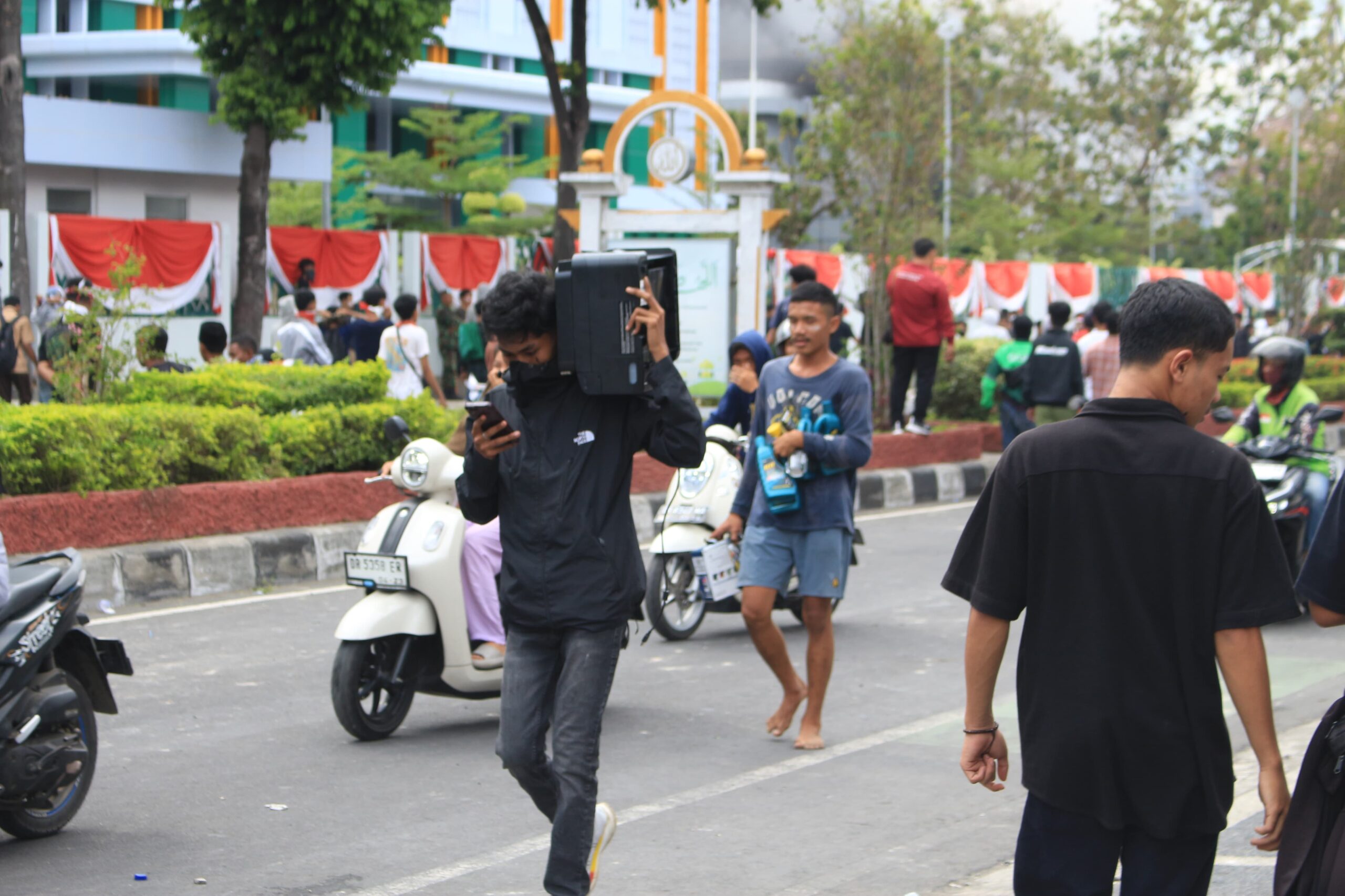 Pantauan WartaSatu di lokasi, sejumlah massa aksi yang mengenakan seragam sekolah maupun pakaian masyarakat biasa terlihat membawa pagar besi, mesin potong rumput, mesin vacuum cleaner, hingga barang-barang elektronik lainnya.