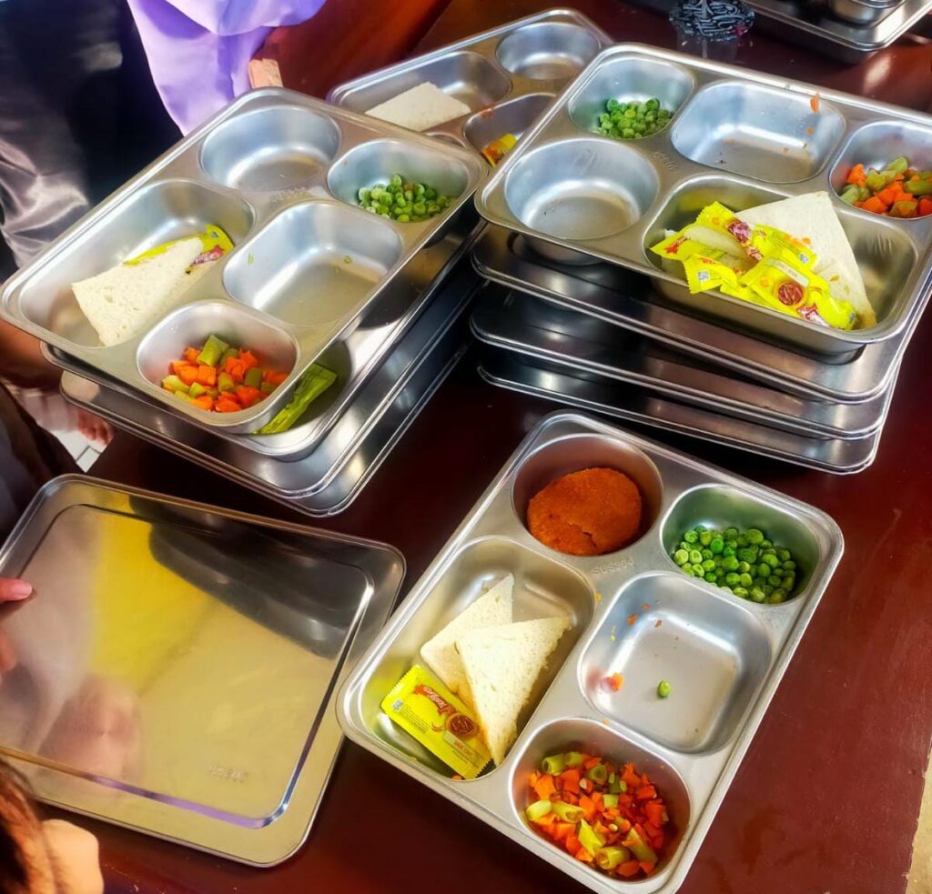 Menu yang disajikan salah satu yayasan pengelola SPPG hari itu berupa roti tawar dengan saus tomat kemasan, sepotong ayam fillet, serta sayur kacang dan buncis rebus.
