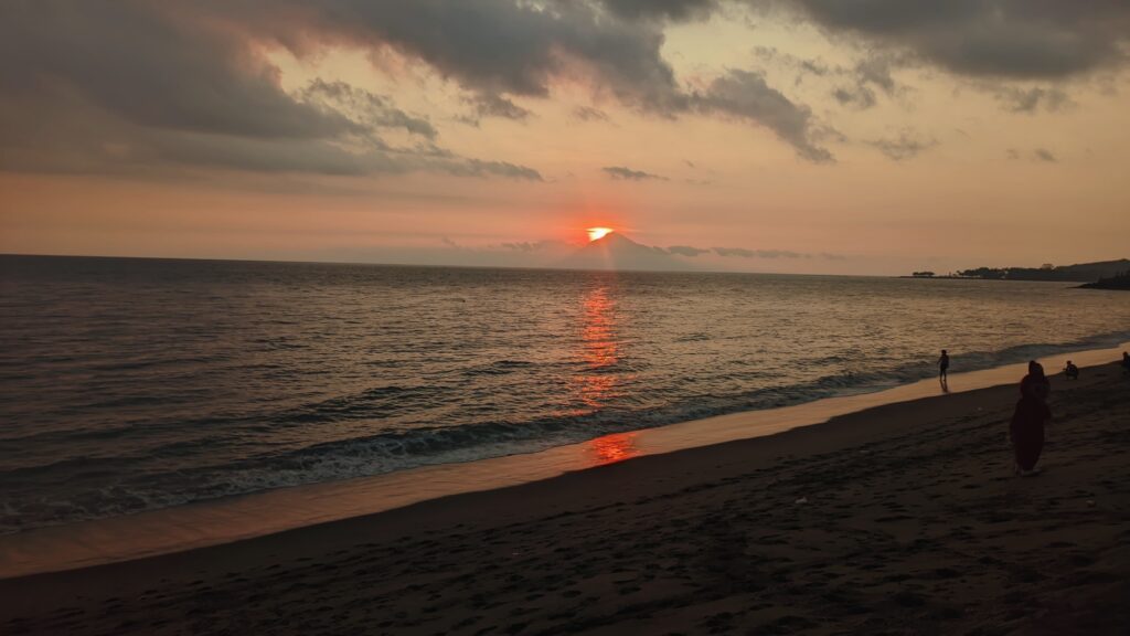 Panorama sunset dengan siluet Gunung Agung Bali di Pantai Duduk, Batu Layar Barat, Lombok Barat. Jumat, (8/8/2025). (dok. Buk/Warta1)