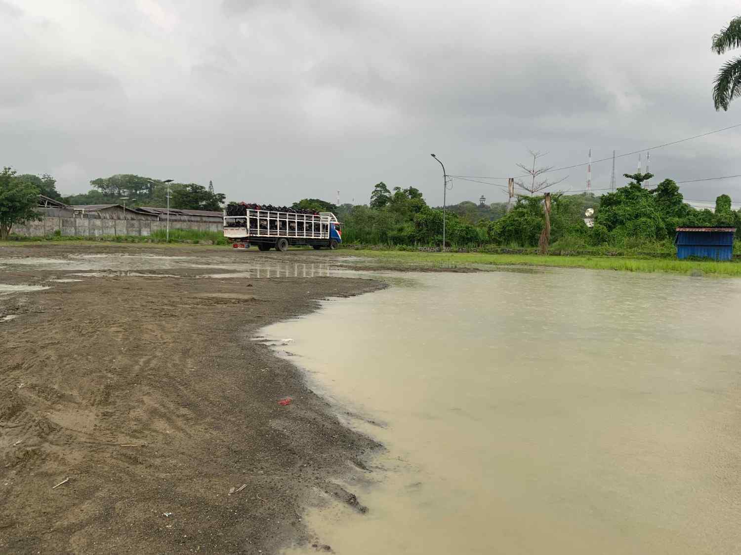 Ia mengaku khawatir kondisi tanah yang becek dan tidak rata dapat merusak kendaraan, sehingga memilih memarkirkan truknya di tepi jalan dekat pintu masuk.