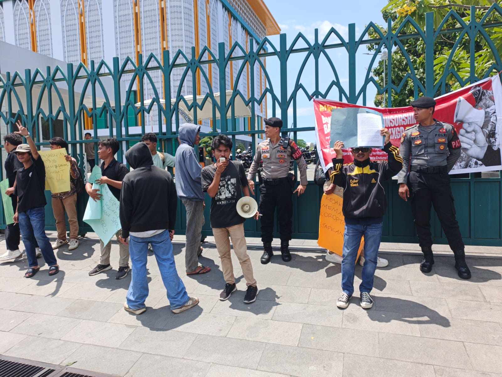 Mataram – Puluhan pemuda yang tergabung dalam Indonesia Law and Democracy Forum, kembali menggelar aksi di depan Kantor Bank NTB Syariah, di Jalan Udayana, pada Kamis (4/12/2025) siang.