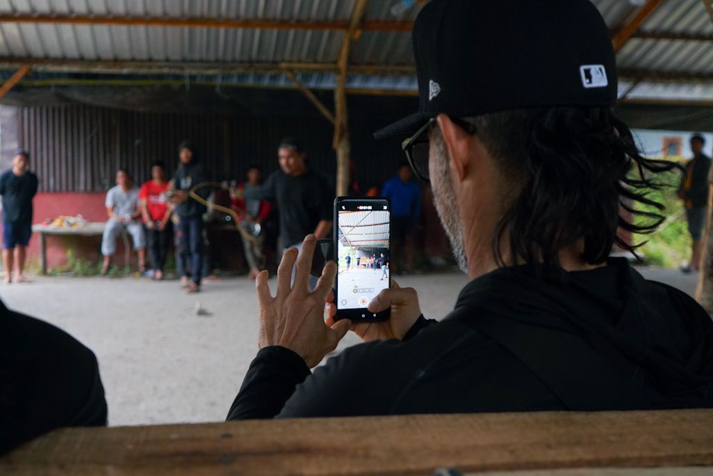 Seorang wisatawan asing tampak antusias mengabadikan momen permainan tersebut. Ia mendekat ke arena, meminta izin untuk memotret salah satu gasing, lalu merekam jalannya permainan dengan kamera ponselnya.