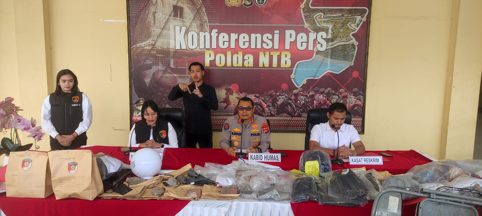 Selain mengamankan para tersangka, polisi juga menyita sejumlah barang bukti berupa batu, pecahan beton, kaca, barang elektronik, pakaian yang dikenakan saat kejadian, serta barang-barang lain yang terkait dengan peristiwa tersebut.