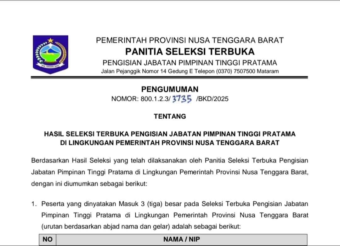 ”Peserta yang telah dinyatakan masuk 3 (tiga) besar untuk melengkapi menyerahkan hasil pemeriksaan Narkoba dan Kesehatan Jiwa dari tanggal 10 September 2025 mulai Pukul07.30 WITA di Sekretariat Pansel Badan Kepegawaian Daerah Provinsi NTB, Jalan Pejanggik Nomor 14 Gedung E Mataram,” tambahnya.