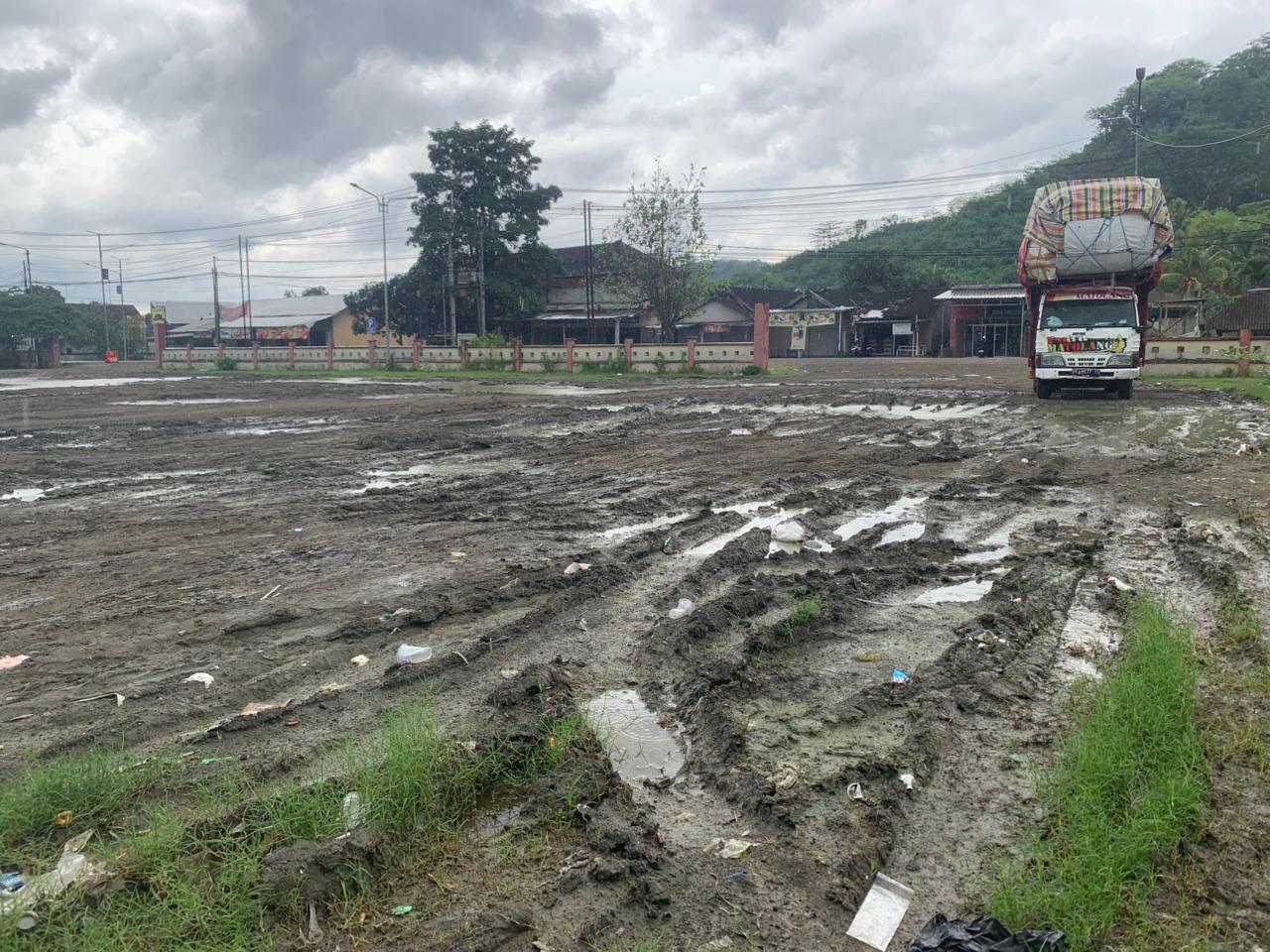 Pantauan di lokasi, hampir seluruh area terminal tergenang air akibat hujan, menjadikan lahan parkir berlumpur dan tidak rata. Akses keluar-masuk kendaraan pun menjadi sulit, terutama bagi truk besar yang biasa parkir di area tersebut.